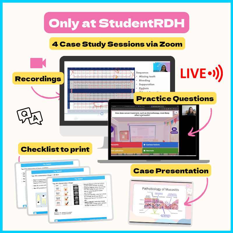 StudentRDH has all the information you need for the boards but it is concise and easy to read and Claire does a great job at giving you tips to help you memorize everything.